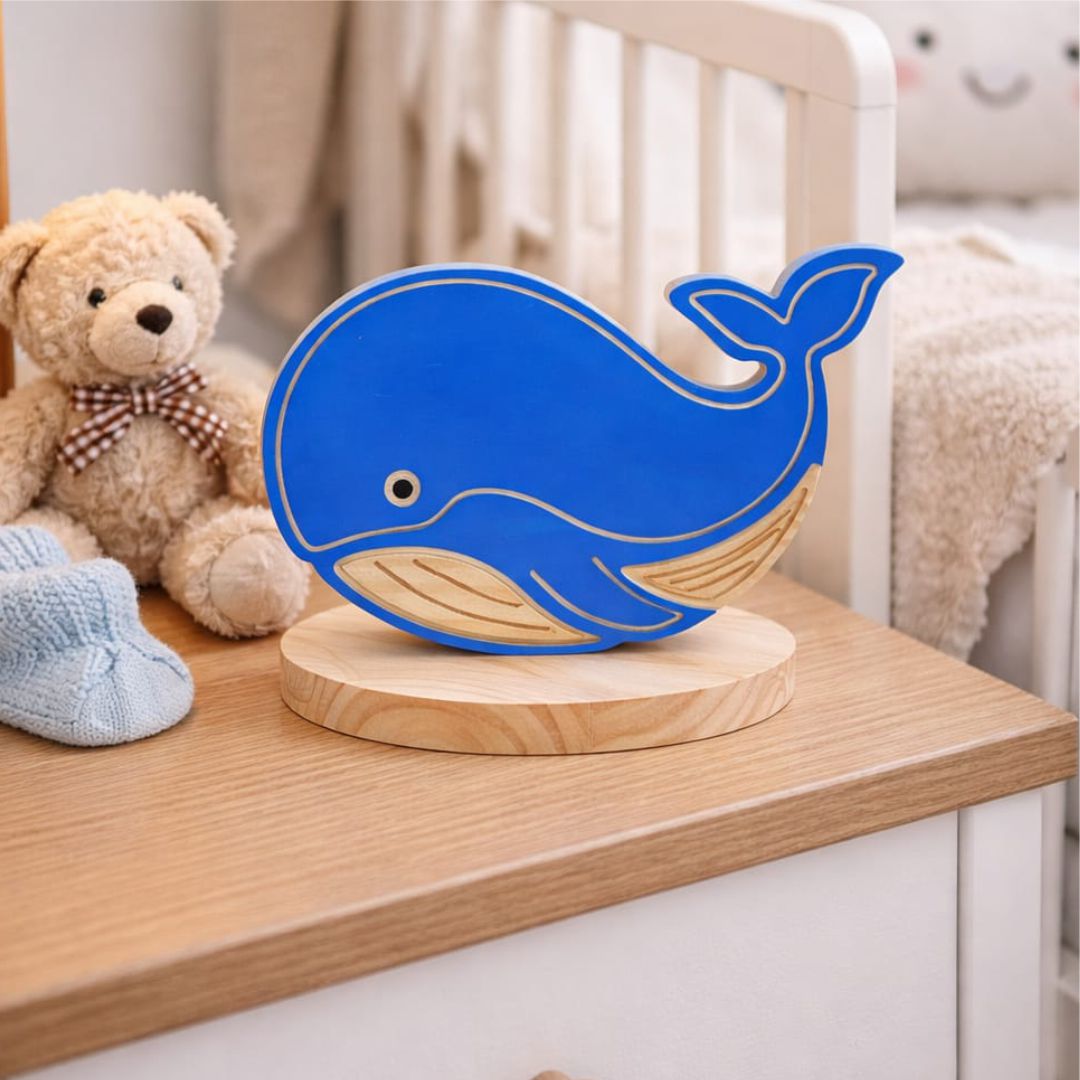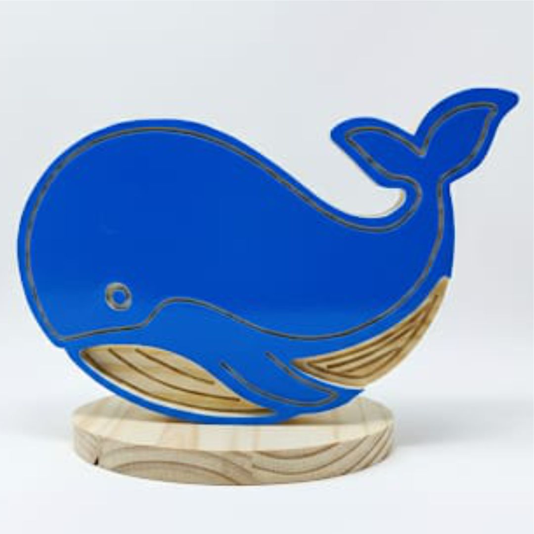 As linhas limpas e elegantes esculpidas na madeira de pinus desenham a silhueta graciosa da baleia, enquanto a resina azul vibrante preenche o corpo, brilhando com a luz e remetendo às águas mais profundas e cristalinas. A base circular de pinus oferece o contraste perfeito e a estabilidade necessária para esta peça de destaque.